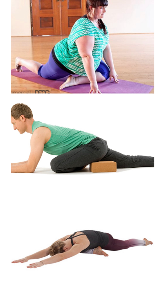 Les dejo muchas fotos para que vean todas las variantes que podes trabajar en una clase. Hay una sola variante que no practicamos, la del piso plegando el cuerpo sobre la rodilla. Hay muchas discusiones sobre ésta variación y la presión que se pone en la rodilla que se flexiona. De todas formas, agregué la foto para que conozcan la postura (Pigeon Pose – Postura de la Paloma versión básica)